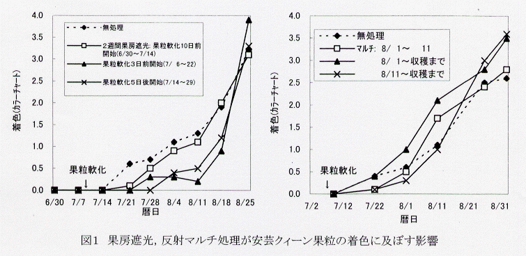 - 反射マルチ処理は、幅1.8mの反射資材を主枝直下の地上面に、主枝に平行に敷いて行った。反射マルチは処理時のみ着色が促進された(図1)。