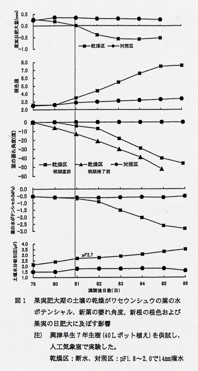 - 満開後79日から乾燥(断水)処理を行うと、明期終了前(夕方)における葉の萎れ角度が約13度になる日(満開後81日)に、果実の日肥大量はゼロになる。さらに、明期(日中)における葉の萎れ角度が約15度を超える日(満開後82日)から、果実の日肥大量はマイナスに転じ、新根の根色値が4(黄土色)に変化する(図1)。以上のような樹体反応から、葉の萎れ角度15度の水分状態が、果実肥大の低下を最小にし、しかも新根を枯死させない最大の水ストレス(適度な水ストレス)、すなわち潅水適期であると判断される。