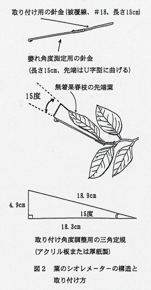 - 『葉のシオレメ-タ-』は、満開後70日頃、十分に潅水を行った2日後の早朝に、地上1.5mの高さに発生している無着果春枝の先端葉に、1樹当たり2カ所、5樹に1樹の割合で取り付ける。三角定規を用いて、葉の先端と葉柄の基部を結ぶ線に対して、萎れ角度測定用の針金の伏角が15度になるように、取り付け用の針金を調整する(図2)。