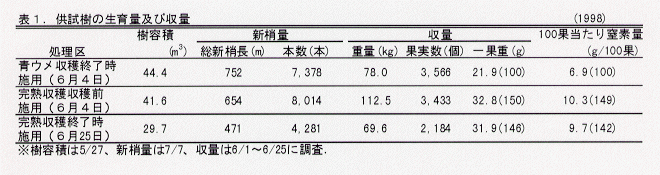 - 完熟収穫果は、青ウメ収穫果に比べ一果平均重が約1.5倍で、100果当たり窒素収奪量も約1.4~1.5倍である(表1)。