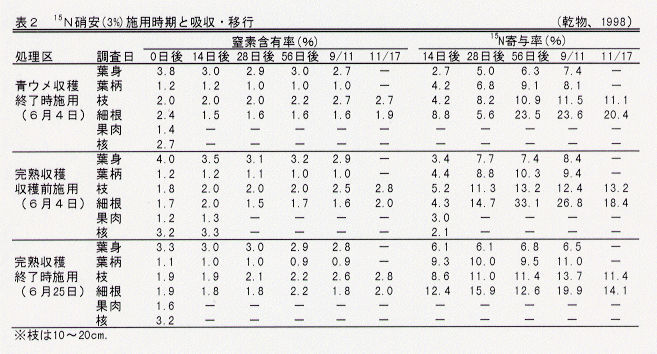 - 6月4日施用では、青ウメ収穫より完熟収穫の方がいずれの器官の15N寄与率も高くなる(表2)。
