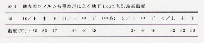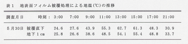 - ハウス内で地表面を農業用ポリフィルムで被覆すると、5月下旬の晴天日には被覆直下で約6時間、地下1cmで約4時間、地温が50℃以上になる(表1)。