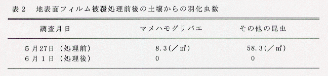 - ハウス内でしゅんぎく収穫直後に地表面を農業用ポリフィルムで被覆すると、5月下旬処理ではマメハモグリバエの蛹が全て死滅する(表2)。
