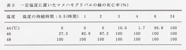- マメハモグリバエの蛹を一定温度に置くと、44℃では24時間、46℃では3時間、48℃では30分で全て死滅する(表3)。