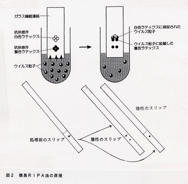 - 簡便な診断には、病原ウイルスに対する抗血清を作製し、リトマス試験紙のように植物汁液に専用のろ紙を浸すことによって、5分後にはウイルス感染の有無(陽性は小点が2つ、陰性は1つ)がわかる迅速免疫ろ紙法(簡易RIPA法)が利用できる(図2、図3)。