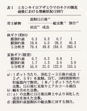 - 夏秋ギク(精雲)と秋ギクの放飼試験においても、膜割れ後の放飼では、膜割れ前に比べ150倍以上に増殖する(表1)。