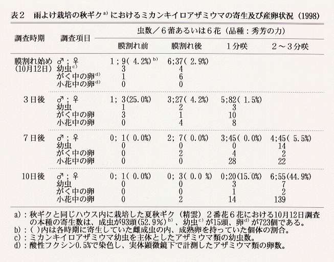 - 夏秋ギクの2番花に成熟卵を持った多数の雌成虫と産卵数が認められる時期でも、同一のハウス内に栽培された膜割れ前の秋ギク上には成虫の寄生はみられるが、産卵数はわずかである。しかし、膜割れ始めから7日以降の1分~2分咲きと開花が進む程、成熟卵を持った雌成虫と小花中の産卵数が増加する(表2)。
