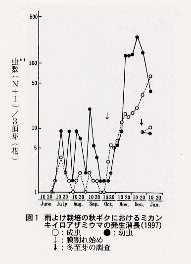 - 雨よけ栽培の秋ギク(秀芳の力)における本種の成虫と幼虫の発生は、膜割れ前のキク上ではわずかであるが、膜割れ後の花の中で急増する(図1)。