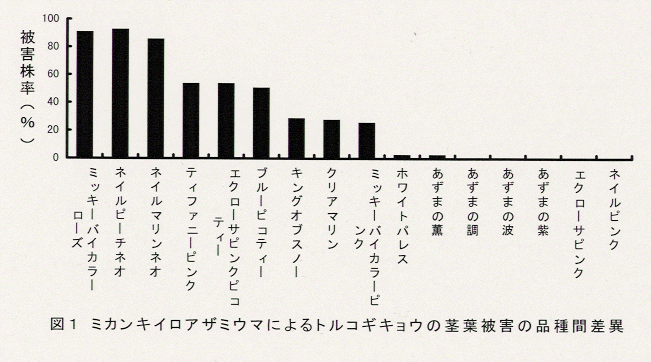 - 現地の同一圃場で栽培された品種間で、茎葉被害に明らかな差異が見られる(図1)。「ミッキーバイカラーローズ」、「ネイルピーチネオ」、「ネイルマリンネオ」の3品種は被害株率が高く、「あずまの紫」、「あずまの波」、「あずまの調」、「あずまの薫」、「エクローサピンク」、「ネイルピンク」、「ホワイトパレス」等の品種では、被害がほとんどない。また、これらの中間の被害を示す品種もみられる。