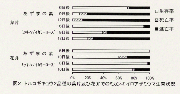 - 「ミッキーバイカラーローズ」と「あずまの紫」の葉及び花弁の切片(寒天培地上)で幼虫を室内(25℃)飼育すると、「あずまの紫」では生存率は低く、生育に不適と考えられる。「ミッキーバイカラーローズ」では生存率は比較的高く、葉での増殖が可能である(図2)。一方、花弁では両品種とも良好な生育を示す。