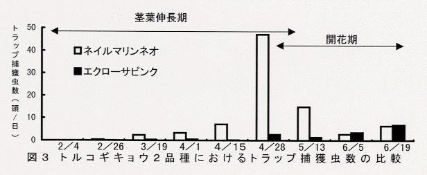 - 2番花の茎葉伸長期(2~4月)において、茎葉被害のない「エクローサピンク」では青色粘着トラップの捕獲虫数は少なく、茎葉被害の多い「ネイルマリンネオ」では捕獲虫数は多く推移し、開花盛期の6月には両品種の捕獲虫数はほぼ同等となる(図3)。