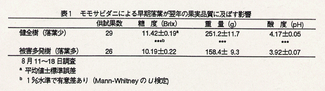 - サビダニの加害によって早期落葉した被害多発樹(9月下旬の落葉率:70~80%)では、健全樹(同5~10%)に比べ、翌年の果実の糖度、重量、酸度がいずれも有意に減少する(表1)。これは被害多発樹で樹勢が低下していることを示唆している。