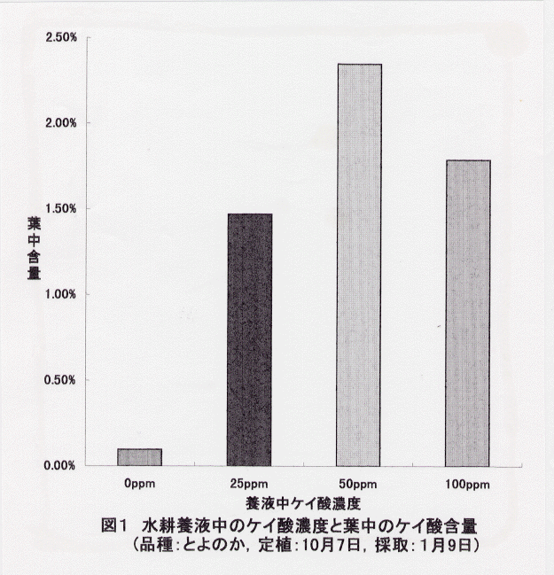 - イチゴの水耕栽培ではケイ酸を効率的に吸収して、養液の添加濃度が高いほど葉中のケイ酸含量は高くなる(図1)。