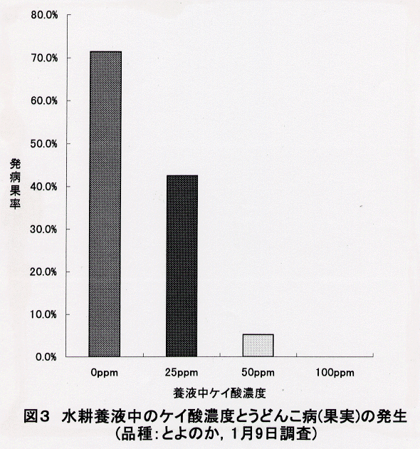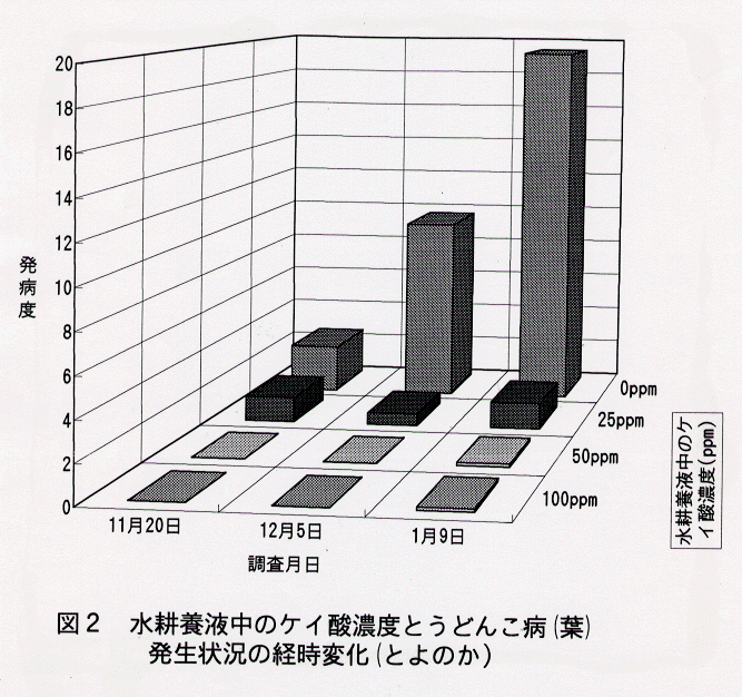 - イチゴの水耕栽培で、養液にケイ酸カリを添加するとイチゴ葉中のケイ酸含量が高まり、うどんこ病の発病を抑制する。うどんこ病罹病性品種「とよのか」では、ケイ酸の養液中濃度25ppm以上、葉中含量1.5%以上で発病抑制作用が顕著である。