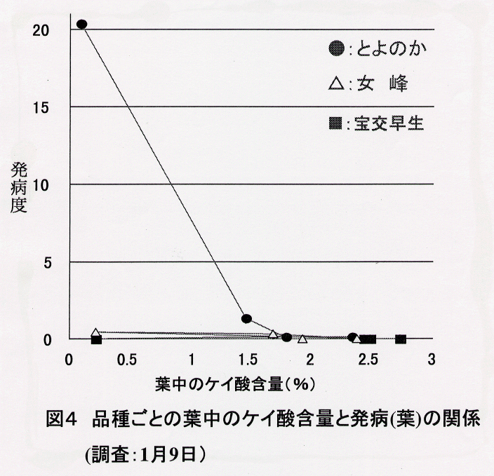 - 葉中のケイ酸含量と葉の発病の関係については、「とよのか」ではケイ酸が1.5%以上で発病を抑制するのに対し、「女峰」や「宝交早生」では0.5%でも極めて発病は少ない(図4)。