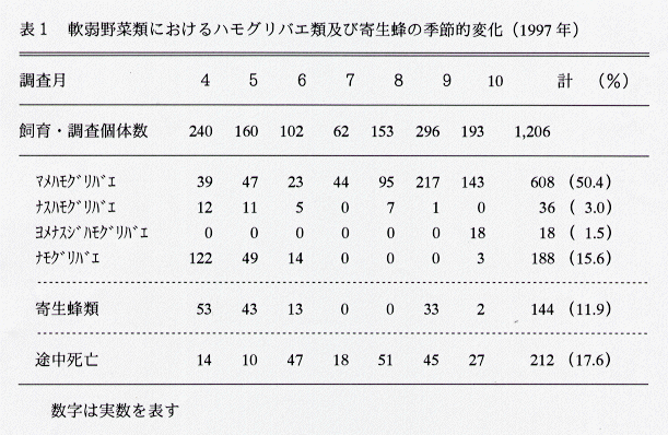 - 軟弱野菜類を加害するハモグリバエ類の種類は4種で、ハモグリバエ類の寄生蜂6種を確認した。その季節的変化は春期にはナモグリバエ、夏~秋期にはマメハモグリバエの寄生が多い。