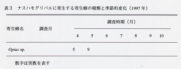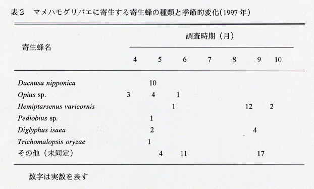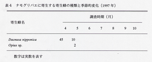 - ハモグリバエ類の寄生蜂としてマメハモグリバエから Dacnusa nipponica, Opius sp., Hemiptarsenus varicornis, Pediobius sp., Diglyphus isaea, Trichomalopsis oryzae (表2)、ナスハモグリバエから Opius sp.(表3)、 ナモグリバエから Dacnusa nipponica, Opius sp.(表4)の合計6種の寄生が認められる(表2)。