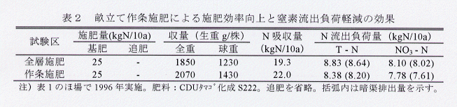 - 緩効性肥料(CDU化成)を利用する場合、畝立て作条施肥によって施肥効率が向上し、追肥(約5kgN/10a)を省略でき、窒素流出負荷も僅かながら軽減できる(表2)。
