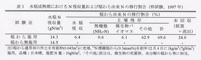 - 施用した稲わら窒素の初年目の水稲利用率は6%と低く、水稲の窒素吸収量も増加しないが、土壌残存率が70%と高く、土壌窒素肥沃度の維持・増強に寄与する(表1)。