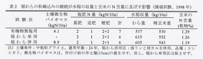 - 稲わら連用田では、有機物無施用田に比べて、微生物バイオマスが明らかに高くなり、施肥節減が可能で、水稲の生産安定と玄米窒素含量の適正化が図れる(表2)。