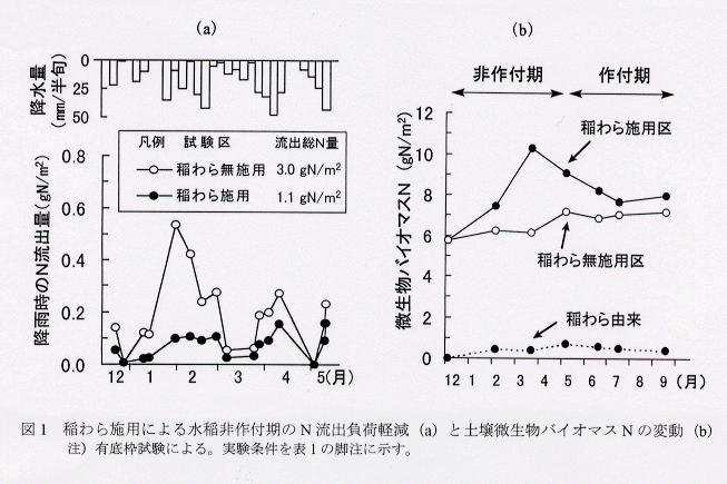 - 水田で稲わらを秋期に鋤込むと、土壌微生物バイオマスが増加し、非作付期の硝酸態窒素の流出負荷を軽減できる。一方、水稲作付期には、微生物バイオマスから窒素が放出され、施肥節減が可能で、生産安定と玄米窒素含量の適正化が図れる。