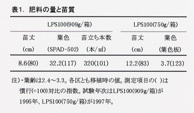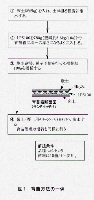 - 水稲コシヒカリの稚苗移植体系における育苗箱全量施肥法においては、被覆肥料(LPS100)を床土と混和しても、床土と種籾の間に挟んだサンドイッチ状態としても良く、慣行の育苗管理を行うことにより丈が短く葉色の濃い苗が得られる。