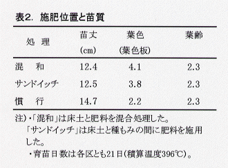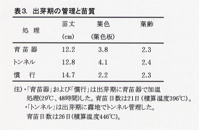 - 出芽期に育苗器を用いる方法で育苗した苗の苗質は、トンネル管理(平置き)法によるものと同等である(表3)。
