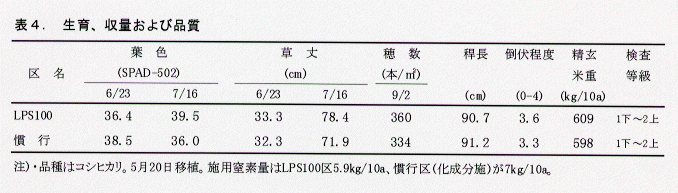 - LPS100の施用位置の違いによる苗質への影響は、LPS100を床土と混和してもサンドイッチ状態(図1の断面図)でも同等である(表2)。