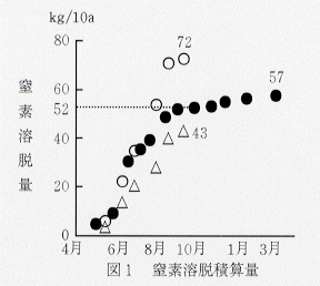 - 4月下旬から10月下旬までのナガイモ栽培期間中に溶脱する窒素量は52~72kg/10aで、これは全調査期間中の窒素溶脱量の約9割に相当すると考えられた。一方、4月下旬から10月下旬までの無肥料・無栽培ほ場からの窒素溶脱量は43kg/10aであった(図1)。