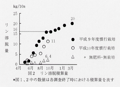 - ナガイモ栽培期間中に溶脱するリン量は11~16kg/10aで、これは全調査期間中のリン溶脱量の6~7割に相当すると考えられた。一方、4月下旬から10月下旬までの無肥料・無栽培ほ場からのリン溶脱量は約6kg/10aであった(図2)。