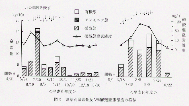 - ナガイモ畑から溶脱する窒素の形態は硝酸態が8~9割を占めた(図3)。土壌浸透水中の硝酸態窒素濃度は、ナガイモ栽培期間中で最高110mg/l、最低7mg/l、平均40mg/l、非栽培期間中(11月上旬から3月上旬まで)で最高17mg/l、最低8mg/l、平均14mg/lであった(図3)。