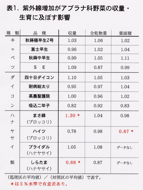 - 野菜の収量に紫外線増加(圃場での栽培全期間)が及ぼす影響は、キャベツ4品種およびダイコン4品種では、統計的に有意には認められなかった。しかしハナヤサイ類では、品種により収量に対する影響が認められた(表1)。