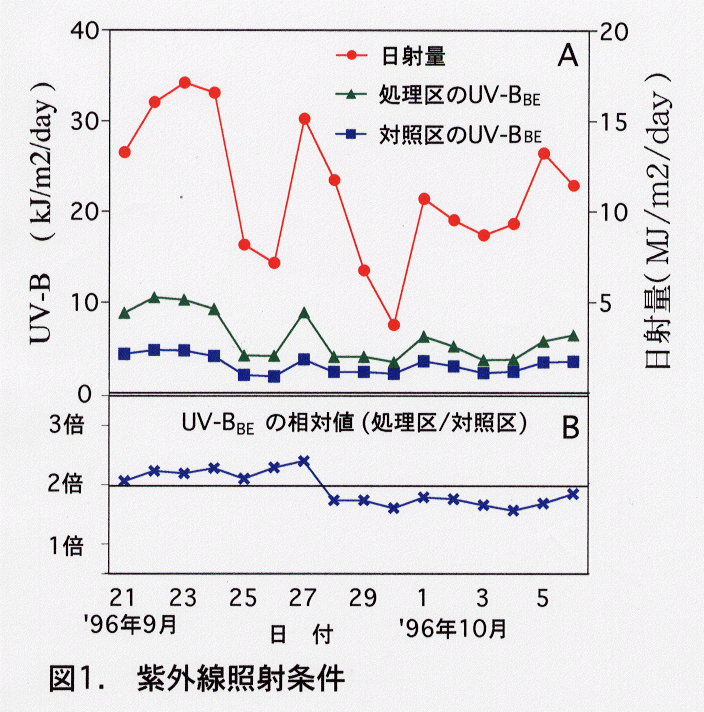 - 紫外線照射強度は、調光型UV-B照射装置を用い、UV-Bの生物学的影響量(UV-B BE)を自然光の2倍とし、UV-B以外のUV-A、可視光などの光環境がほとんで同じになるようにした(図1)。これはオゾン層が40%程度破壊された状況に相当する。WMO(世界気象機構)の予測では、中緯度地帯のオゾン層破壊は10%程度である。