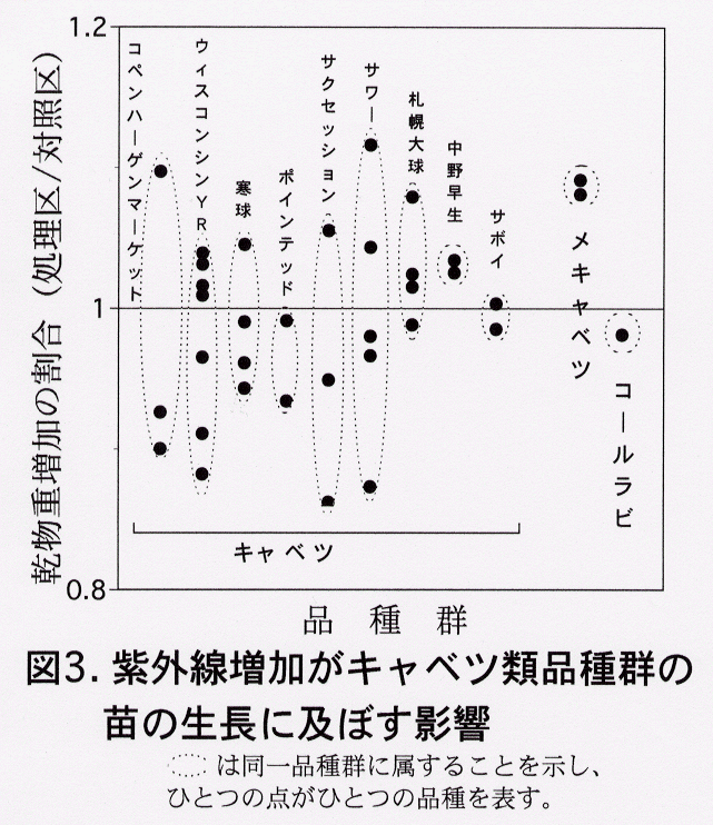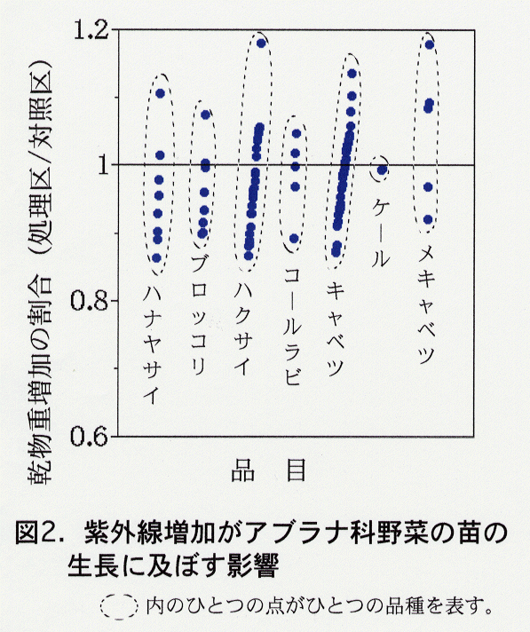 - 中緯度地帯に属する我が国で予想される10%程度のオゾン層破壊に伴って生じる紫外線増加が、キャベツ、ハクサイ、ダイコン等アブラナ科露地野菜の生育・収量に及ぼす影響は極めて小さいと考えられる。