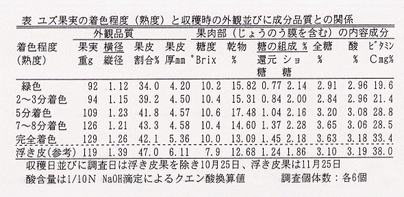 - ユズの果皮及び果汁は冬の風物詩として重宝がられている。4月始めまで消費需要は高いが、長期にわたる生果での安定貯蔵技術は確立されていない。そこで、ユズ果実の着色程度(熟度)と果実品質との関係を明らかにし、貯蔵性について検討する。