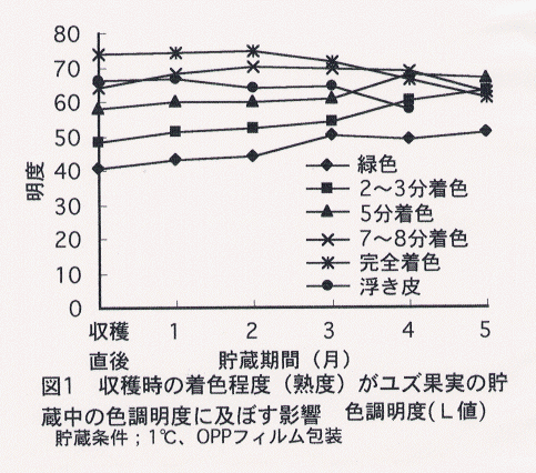 - 色調の明度(L値)と彩度は、収穫時の着色が進むほど高くなり、完全着色果が最も高い。貯蔵(1℃)期間が長くなるに従い完全着色果と浮き皮果の明度が低下し、7~8分着色果の彩度、緑色果、2~3分着色果及び5分着色果の明度、彩度が高くなる(図1、2)。