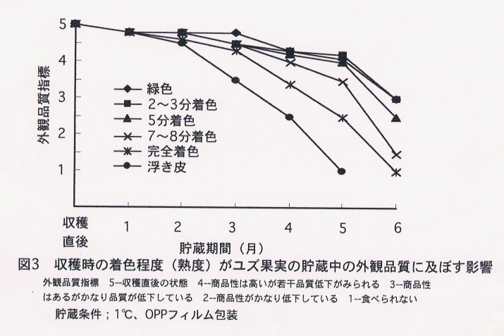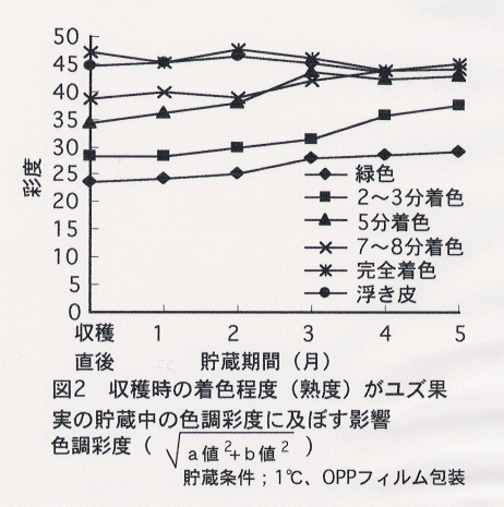 - ユズは収穫時の着色(熟度)の進行に伴い、果皮の厚み、糖及びビタミンC含量が増加する。貯蔵性は緑色果~5分着色果が優れており、低温(1℃)とフィルム包装の組み合わせで、収穫時から5か月間良品質の状態が生果で保持できる。