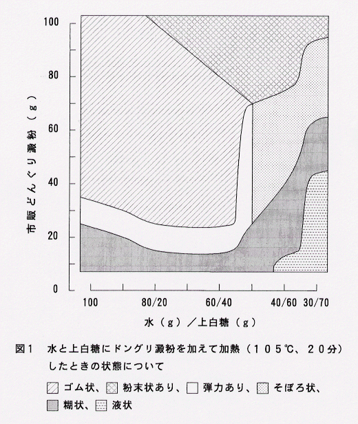 - ドングリ澱粉を加熱糊化するには、水と上白糖が30:70の割合のときにどんぐり澱粉に対して最も少ない加水量で加熱糊化できる(図1)。どんぐり澱粉を加熱糊化した状態のうち、そぼろ状より糊状の方が糯米より杵と臼とでついたモチに混合しやすい。