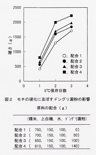 - ドングリモチを調製するとき、糯米の一部をドングリ澱粉に置き換えていくと、ドングリモチの硬さが大きくなり、ドングリ澱粉は老化しやすい(図2)。