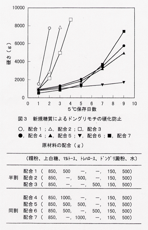 - ドングリモチの硬化防止には、糯粉にドングリ澱粉を加えたものの半量の糖類を添加したもの(以下、半割と称す)ではマルトース、トレハロースの効果がみられ、中でもトレハロースを添加した配合3は最も効果がみられる。糯粉にドングリ澱粉を加えたものと同量の糖類を添加したもの(以下、同割と称す)では半割に比べて格段に硬化が抑制され、中でも上白糖とトレハロースとを半々に用いた配合6に著しい硬化防止効果がみられる(図3)。