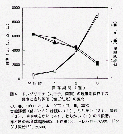 - ドングリモチの丸モチは、上白糖とトレハロースを半々に用いた同割では、保存温度は硬化に影響を及ぼさず、2週間近くの日持ちがみられる(図4)。