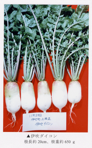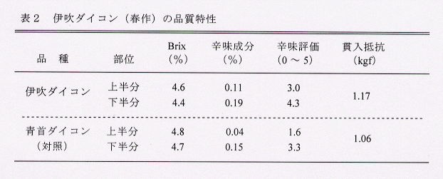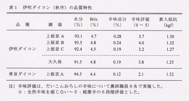 - 伊吹ダイコンは、栽培圃場、作期に関係なく青首ダイコンに比べ辛味が強く水分も少ないことから薬味用に適する品種である。