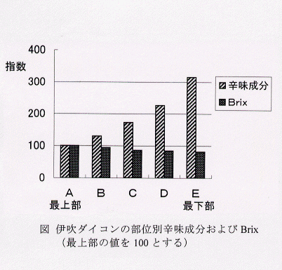 - 伊吹ダイコン漬物の辛味成分は生ダイコンに比べ1/10以下に減少する。