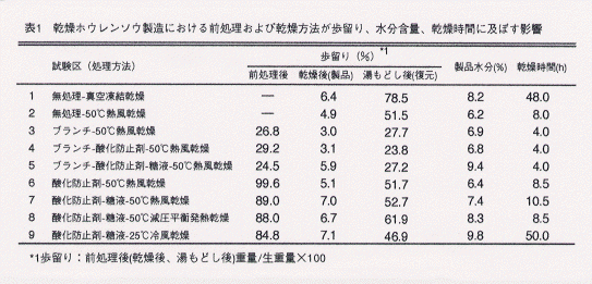 - ホウレンソウはブランチング処理により重量は1/4程度に減少し、乾燥後や湯もどし後の歩留まりは低いが、乾燥に要する時間はブランチング処理を行わないものに比べて半分程度の時間に短縮できる。糖液浸漬処理は製品歩留まり及び製品水分が高くなる。真空凍結乾燥法、冷風乾燥法は熱風乾燥法の6~12倍の時間を要する(表1)。