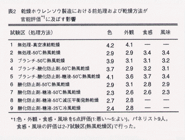 - 50℃熱風乾燥法の製品の色、外観は、真空凍結乾燥法の製品には及ばないが、50℃減圧平衡発熱乾燥法や25℃冷風乾燥法の製品と変わらない(表2)。