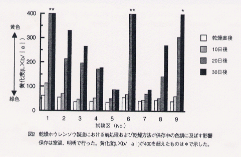 - 乾燥ホウレンソウの色調をハンター値の黄化度(L×b/|a|)で比較した場合、ブランチング処理は製造直後の黄化度が低く(緑色が濃い)、色の評価が高い。また、糖液浸漬処理は明所室温下で保存中の緑色保持に顕著な効果が認められる(図2)。