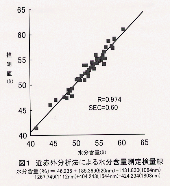 - 水分含量測定用検量線は検量線作成用として48点、検量線評価用として10点用いた。サンプルの水分含量は41.1%~60.5%である。検量線は原スペクトルを用い 920, 1064, 1112, 1544, 1805 の5波長で、重相関係数R=0.974、検量線標準誤差SEC=0.60である。