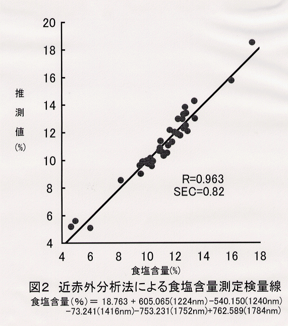 - 食塩含量測定用検量線は検量線作成用として49点、検量線評価用として10点用いた。サンプルの食塩含量は4.45%~17.6%である。検量線は原スペクトルを用い 1224, 1240, 1416, 1752,1784 の5波長で、重相関係数R=0.963、検量線標準誤差SEC=0.83である。