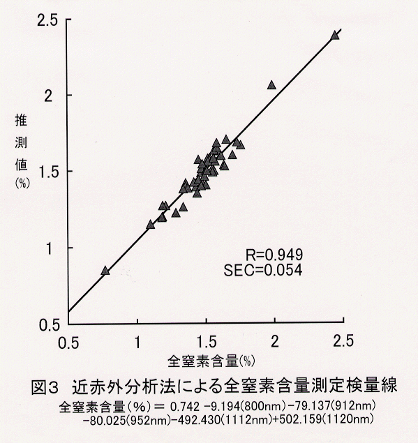 - 全窒素含量測定用検量線は検量線作成用として48点、検量線評価用として10点用いた。サンプルの全窒素含量は0.76%~2.45%である。検量線は原スペクトルを用い 800, 912, 952, 1112, 1120 の5波長で、重相関係数R=0.949、検量線標準誤差SEC=0.054である。