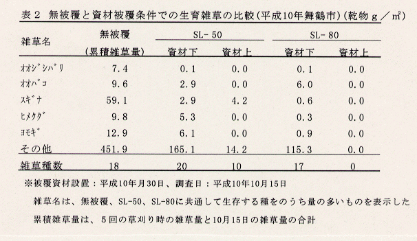 - 抑草効果、資材上への雑草の抽出程度等から、SL-80が被覆資材として有効である。